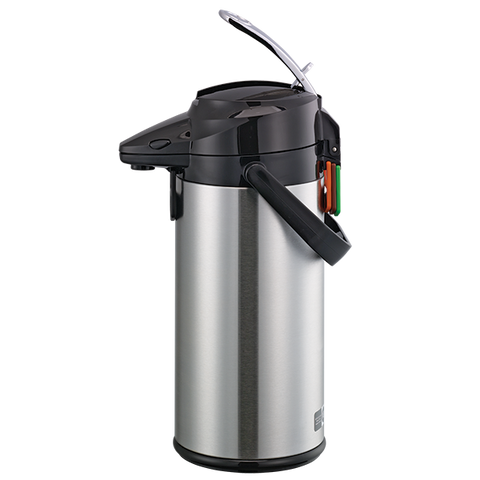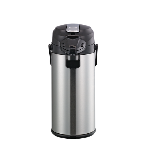 Termo dispensador para café, capacidad de 2.2 litros con revestimiento de vidrio. Cuenta con una cubierta exterior de acero inoxidable, que proporciona una capa adicional para proteger el interior de vidrio.